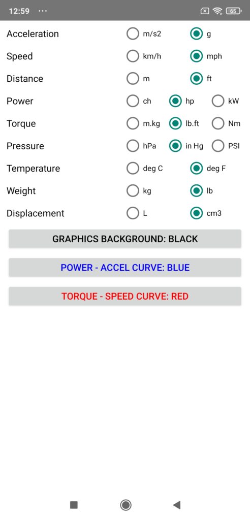 Press Units/Colors. A list of 9 physical quantities is displayed, for each of them you must choose its unit (metric or imperial in general), by selecting the desired unit. Below these 9 physical quantities, 3 buttons are available to you to choose the color of the background (black or white) and the power & torque and acceleration & speed curves (white / red / green / blue) of the power and accelerations graphs. Press these buttons until the desired color is selected. Once all units/colors have been chosen, return to the Setup screen by pressing the BACK button.