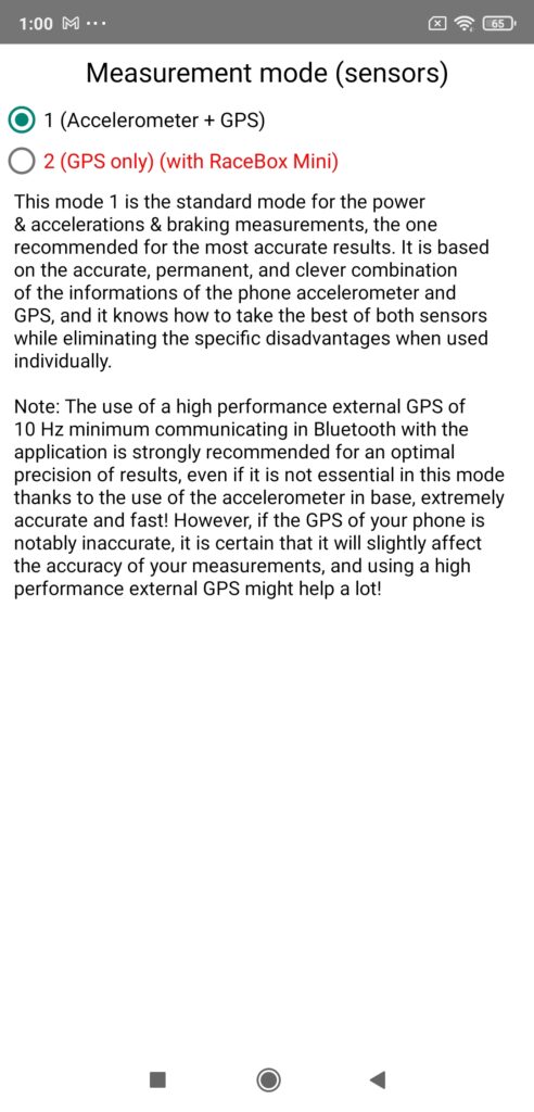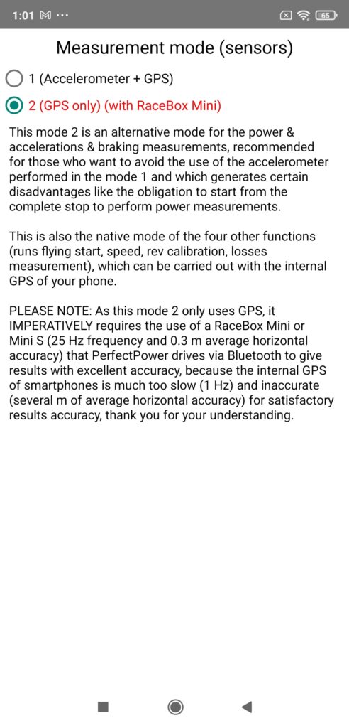 IMPORTANT 1: The reference mode is mode 1 (Accelerometer + GPS), and it is also not only the default mode but also the only one usable with your phone alone (having an accelerometer and a GPS): indeed and as said just before, you must have a RaceBox Mini or Micro to be able to use mode 2 (GPS only), because it is the only all-public external GPS with an accuracy (0.3 m average horizontal accuracy) and a frequency (25 Hz) sufficient to offer results having an accuracy at the level of the very high PerfectPower standards (defined HERE) and those obtained in mode 1… thank you for your understanding!