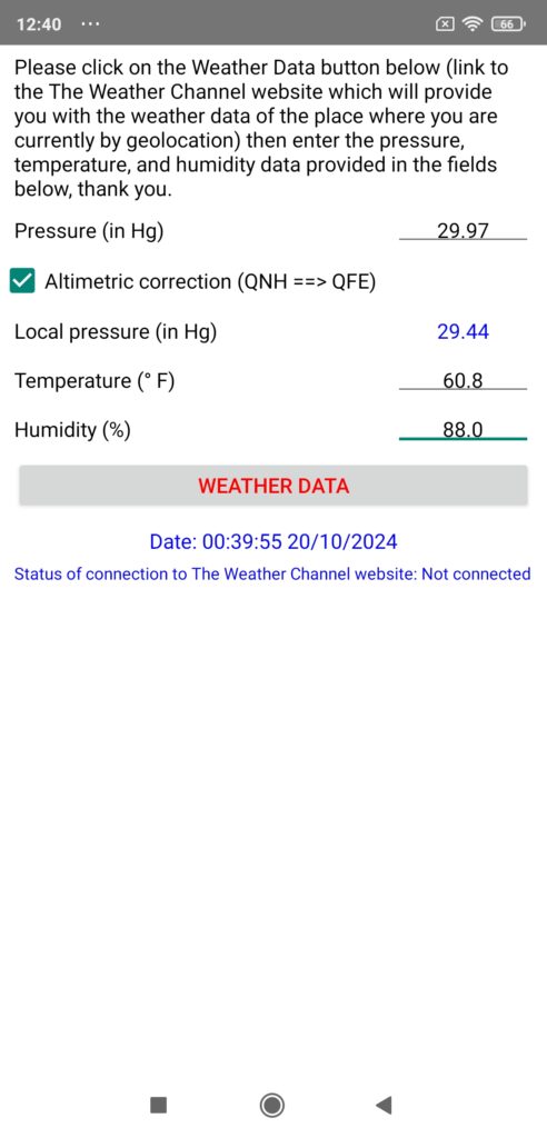 Note 2: PerfectPower provides you with valuable assistance (function of manual recovery of weather data) by providing you with a link to The Weather Channel website which will provide you with weather data for where you are currently by geolocation: you just need to click on the Weather Data button located just below the 3 weather fields, read these 3 weather data (Pressure, Temperature, and Humidity) on The Weather Channel website, and finally enter them in the 3 weather fields after returning to the Weather screen, and that’s all!