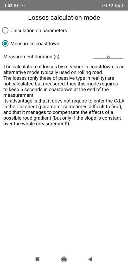 In this mode, the losses (only those of “free” type in reality) are not calculated but measured in a freewheeling phase to be carried out once the measurement itself is completed, by freewheeling (by disengaging) for a time to also configure (“Measurement duration (s)” field, min 5 s and max 15 s).