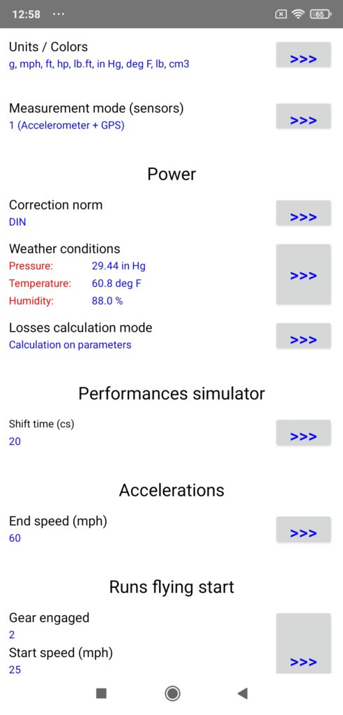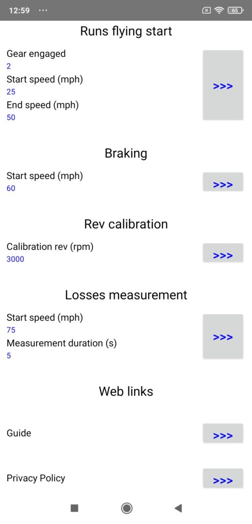 IMPORTANT 2: In reality, of the 7 types of measurements that can be performed with PerfectPower (power, accelerations, runs flying start, braking, speed, rev calibration, and losses measurement), only 3 are impacted by the choice of measurement mode: power, accelerations, and braking. Indeed, the other 4 are natively performed with only GPS (whether it is the phone’s internal GPS or an external GPS), and therefore naturally work in mode 2 regardless of the measurement mode chosen.