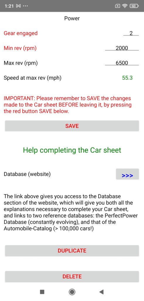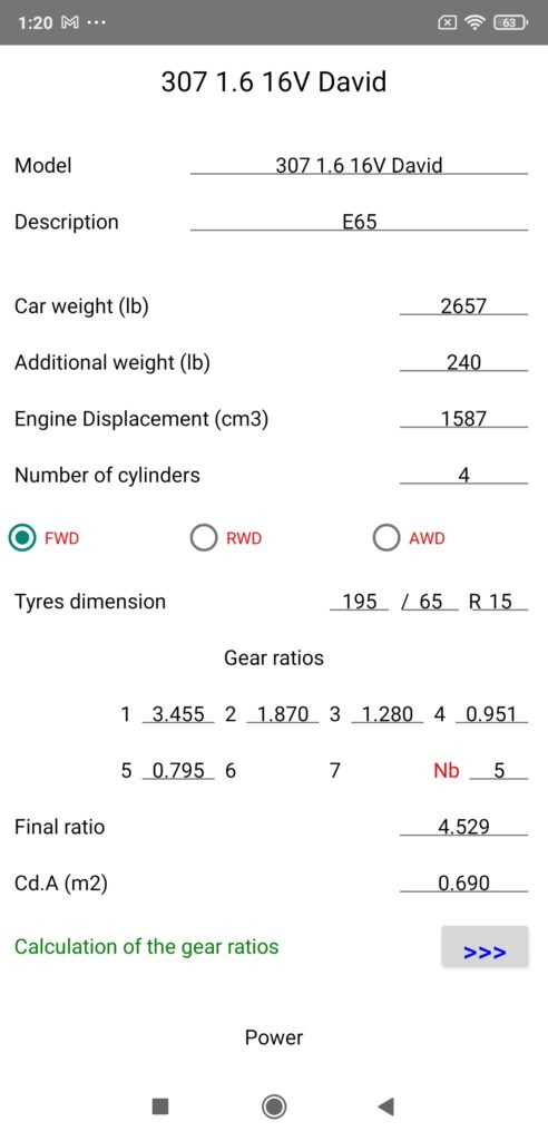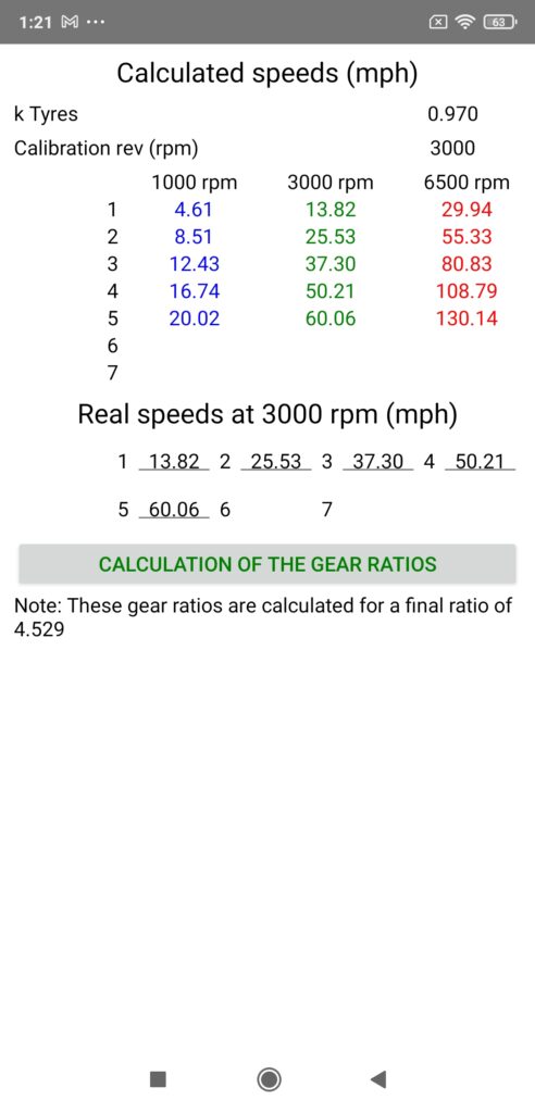 To use it, you just need to measure the stabilized speeds on each gear at 3000 rpm with PerfectPower (GPS speed permanently displayed at the top of the Perfs screen), then enter them in the corresponding fields in this option (remember to close the small keyboard after typing), and finally press the “Calculation of the gear ratios” button located just below the fields: PerfectPower will then calculate your new gear ratios, and put them in the corresponding fields “Gear ratios” in the Car sheet!
