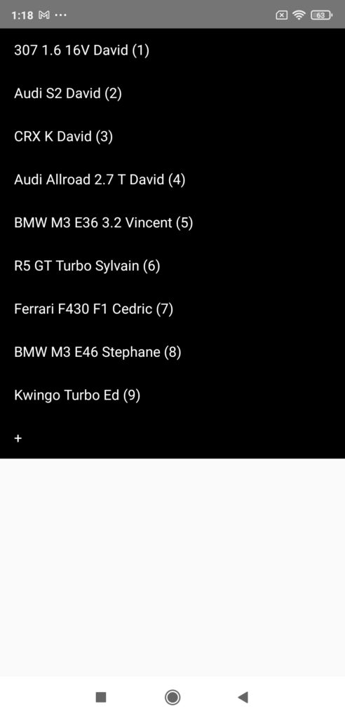 Click on the row corresponding to the desired car, or on the + row if you want to create a new car. You then access its sheet, which you will have to fill in completely. Once completed, don’t forget to save the information entered by pressing the “SAVE” button (important!), and return to the Cars screen by pressing the BACK button.