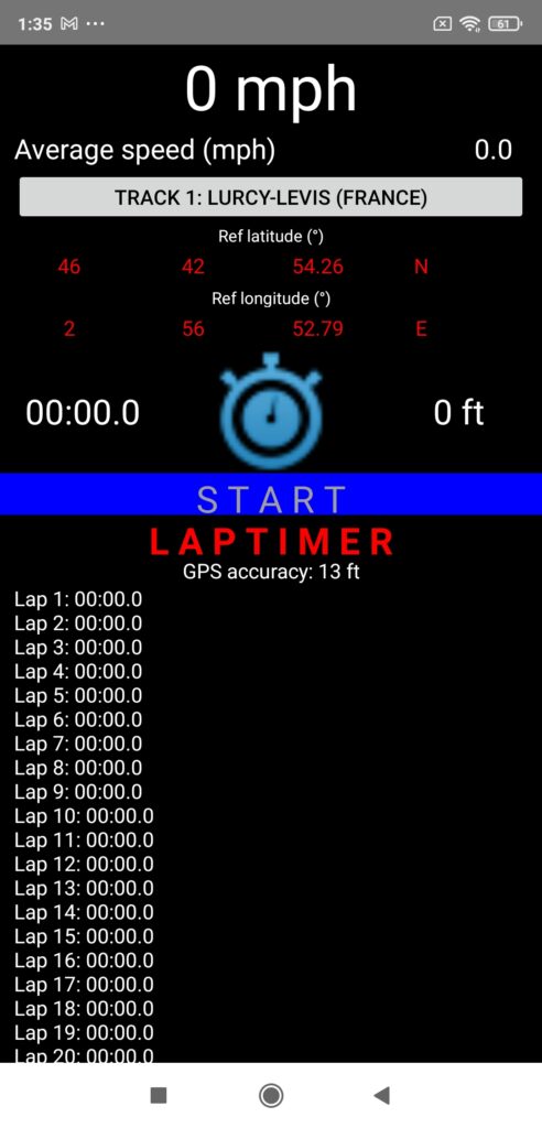 The gray bar at the top of the screen displays the name of the selected track. Press it to scroll through the list of available tracks (only two in August 2025: Lurcy-Levis and Le Castellet, both in France), or to select the “Free choice” mode which allows you to freely choose the GPS coordinates of a reference point of the track on which you are going (ideally the middle of the finish line). In the second case, you will have to search these GPS coordinates on Google Earth or in a “Lap Timer” specialized application (Harry’s Lap Timer, RaceChrono), then enter them in the application in the fields “Ref latitude (°)” and “Ref longitude (°)” in the DMS system (degrees, minutes, seconds). In this system, enter for the latitude and the longitude and from left to right the degrees (integer number), the minutes (integer number), the seconds (decimal number with a precision of 2 digits after the decimal point), and finally the quarter globe (latitude: N for North / S for South, longitude: E for East / W for West).