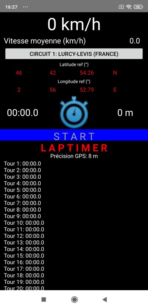 La barre grise en haut de l’écran affiche le nom du circuit sélectionné. Appuyez dessus pour faire défiler la liste des circuits disponibles (deux seulement en Août 2025: Lurcy-Levis et Le Castellet, tous deux en France), ou pour sélectionner le mode “Choix libre” qui permet de choisir librement les coordonnées GPS d’un point de référence du circuit sur lequel on se rend (idéalement le milieu de la ligne d’arrivée). Dans le second cas, vous devrez chercher ces coordonnées GPS sur Google Earth ou dans une application spécialisée “Lap Timer” (Harry’s Lap Timer, RaceChrono), puis les saisir dans l’application dans les champs “Latitude ref (°)” et “Longitude ref (°)” dans le système DMS (degrés, minutes, secondes). Dans ce système, rentrez pour la latitude et la longitude et de gauche à droite les degrés (nombre entier), les minutes (nombre entier), les secondes (nombre décimal avec une précision de 2 chiffres après la virgule), et enfin le quart de globe (latitude: N pour Nord / S pour Sud, longitude: E pour Est / O pour Ouest).