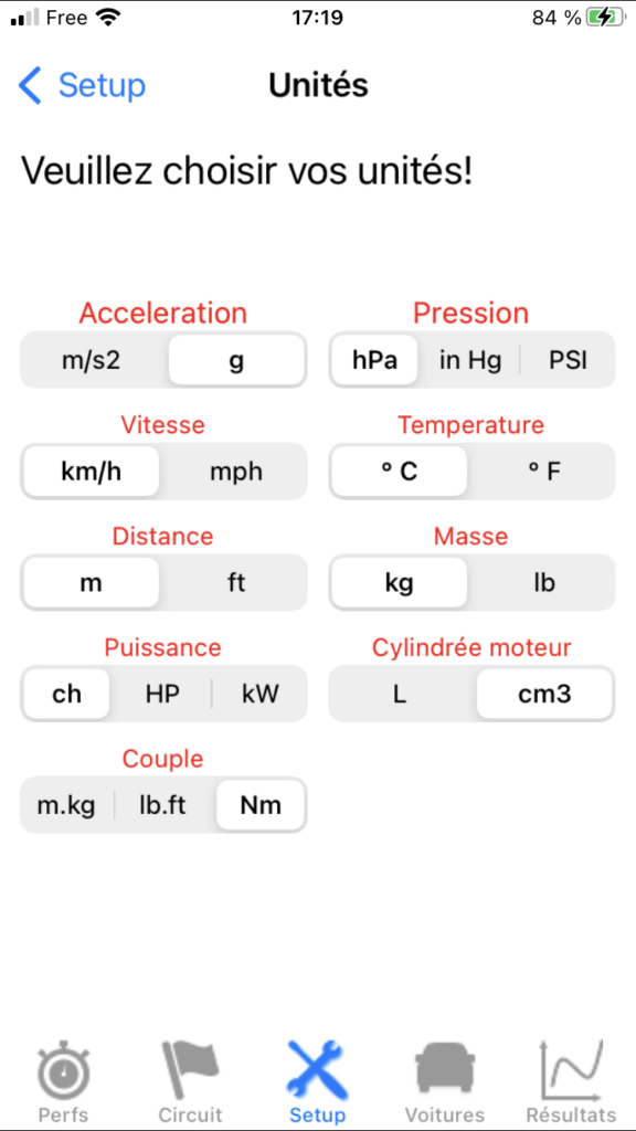 Appuyez sur Unités. Une liste de 9 grandeurs physiques s’affiche, vous devez pour chacune d’elle choisir son unité (métrique ou anglo-saxonne en général), en sélectionnant l’unité voulue. Une fois toutes les unités choisies, retournez à l’écran Setup en appuyant sur la touche BACK.