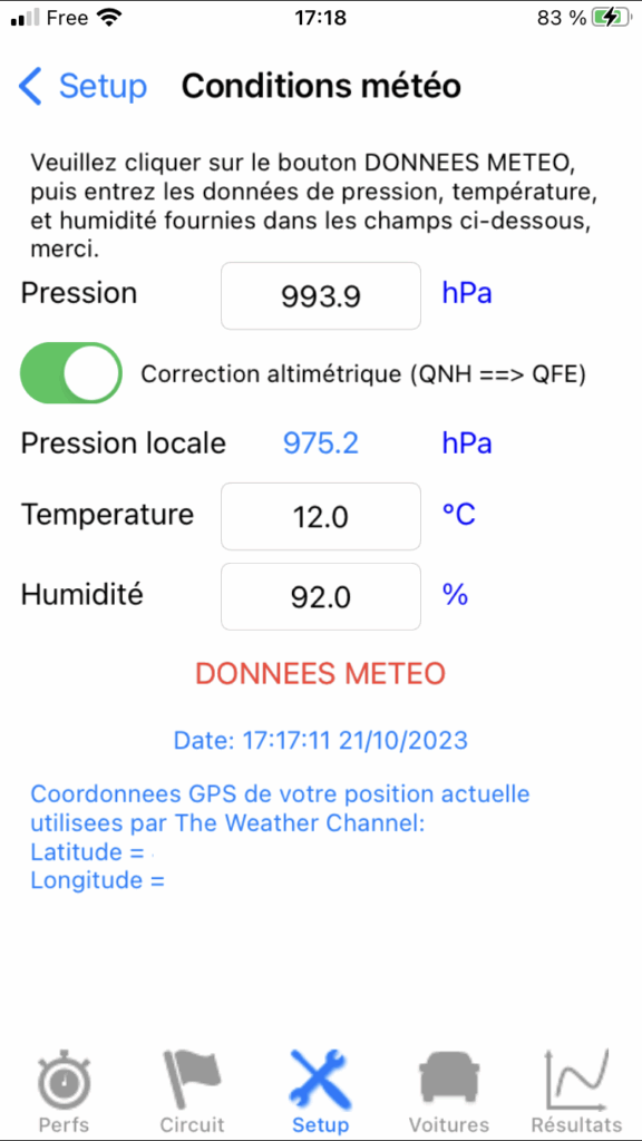Note 4: Attention, il est nécessaire d’attendre environ 10 s en écran Perfs après ouverture de l’application (temps d’obtention d’un signal GPS suffisamment précis) avant de vous rendre dans cet écran Météo faire la récupération manuelle des données météo! En effet, le GPS étant coupé dès la sortie de l’écran Perfs pour économiser la batterie, les infos GPS utilisées pour la récupération manuelle des données météo sont celles relevées au moment précis où vous quittez l’écran Perfs pour vous rendre dans l’écran Météo, et elles n’existent (et ne sont fiables) qu’à partir d’environ 10 s après ouverture de l’application.