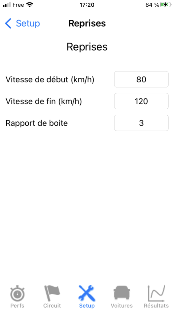 Note 1: C’est bien sûr le rapport de boite engagé au début de la reprise qui doit être sélectionné. Par exemple, si vous désirez faire un 60-160 km/h en 2/3/4, il faut rentrer le rapport 2.