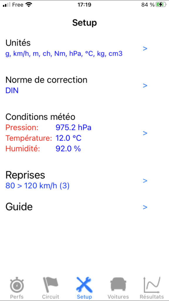 Note 1: La saisie des conditions météo est INDISPENSABLE: en effet, celles-ci ne sont pas seulement nécessaires à la correction des résultats moteur faite par la norme de correction paramétrée juste avant, mais elles le sont aussi au calcul dynamique de la résistance de l’air pendant les mesures!