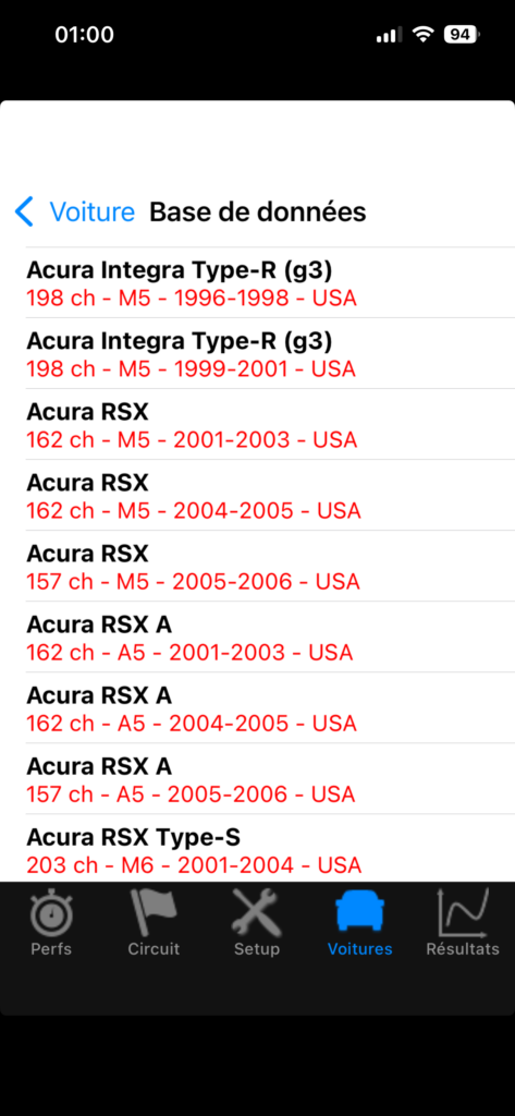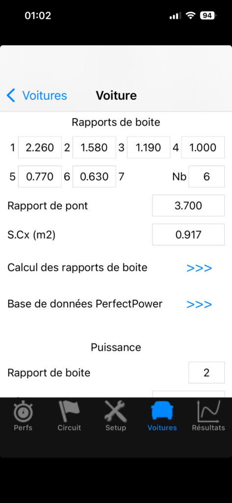 1) Intégration de la base de données PerfectPower directement dans l’application, permettant ainsi de créer instantanément une voiture si celle-ci est présente dans la base de données (394 voitures à ce jour), tout en conservant bien entendu la possibilité d’une personnalisation de toutes ses données (indispensable pour les voitures modifiées)