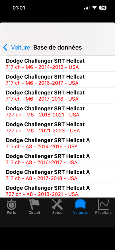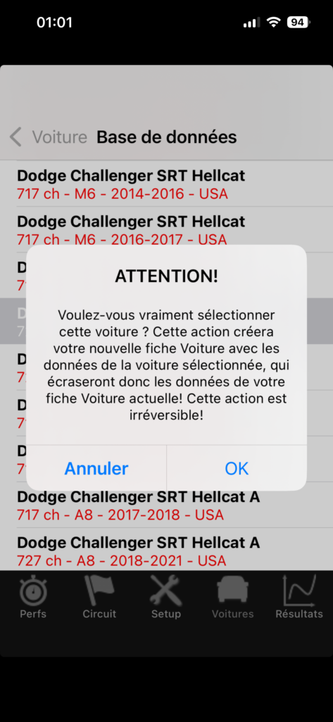 IMPORTANT: Cette version qui n’était pas initialement prévue constitue une surprise que je tenais à faire au public iOS! En effet, elle intègre la base de données PerfectPower directement dans l’application, une mise à jour que je pensais colossale techniquement et qui devait être faite seulement cet été dans les deux versions Android et iOS, mais devant les nombreuses demandes mails concernant cette fonction, je me suis penché dessus Jeudi dernier, et je me suis rendu compte que c’était faisable bien plus rapidement que ce que je pensais, et j’ai développé la partie technique en un temps record de 7 heures seulement Vendredi dernier! Le plus long a en fait été la modification du programme pour interagir avec la base de données du point de vue utilisateur (création et gestion d’une “page-liste” avec le maximum d’infos d’identification véhicule), ainsi que les ajustements graphiques nécessaires, mais tout a été terminé et testé sous tous les angles en moins d’une semaine, et l’application vient juste d’être validée par Apple! Voici quelques photos d’illustration: