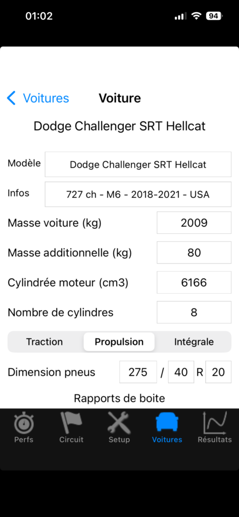 1) Simulateur de Performances: Le paramétrage du temps de changement des rapports est désormais associé à la voiture et est donc deplacé du Setup vers la fiche Voiture