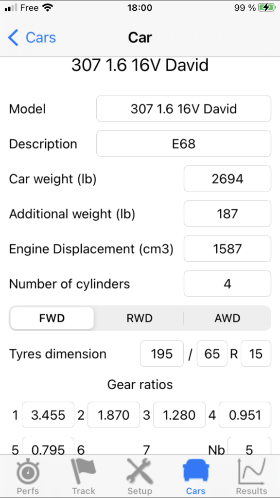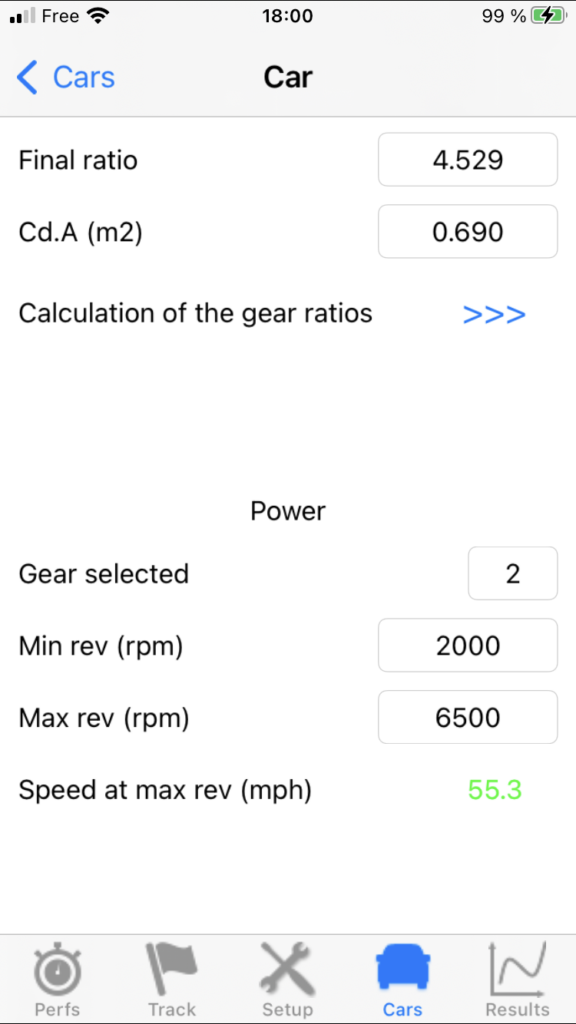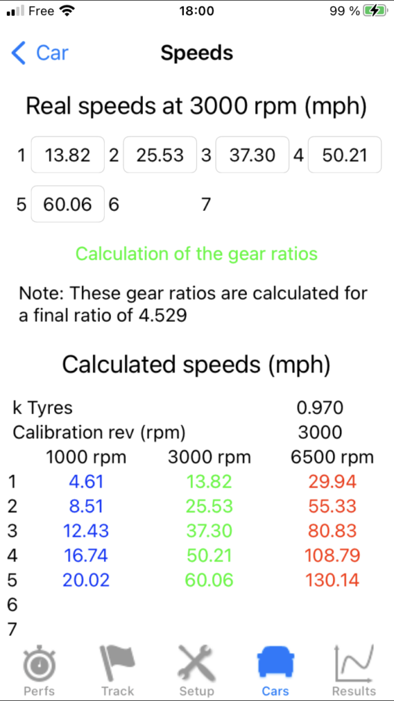 To use it, you just need to measure the stabilized speeds on each gear at 3000 rpm with PerfectPower (GPS speed permanently displayed at the top of the Perfs screen), then enter them in the corresponding fields in this option (remember to close the small keyboard after typing), and finally press the “Calculation of the gear ratios” button located just below the fields: PerfectPower will then calculate your new gear ratios, and put them in the corresponding fields “Gear ratios” in the Car sheet!