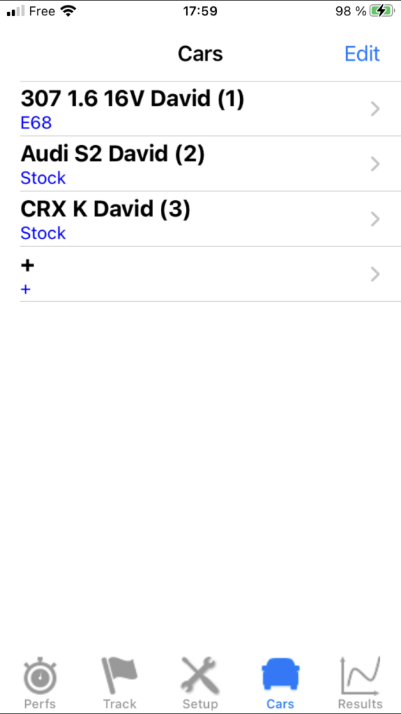 Click on the row corresponding to the desired car, or on the + row if you want to create a new car. You then access its sheet, which you will have to fill in completely. Once completed, you can return to the Cars screen by pressing the BACK button.