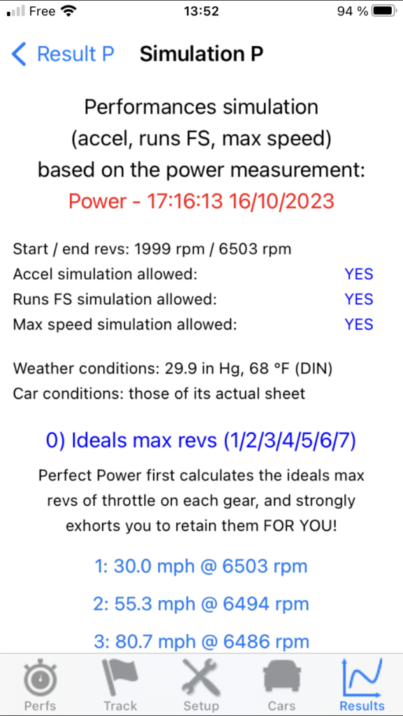 1) The simulator indicates to you at the beginning of its report the simulations that it was able to carry out (accelerations, runs flying start, max speed) according to the revs at the start and end of the power measurement. Indeed, it cannot necessarily simulate all the measurements: for example, if your power measurement starts at 3000 rpm and stops at 3500 rpm, the simulator will not be able to simulate an acceleration since it will not know the power during any change of gear since the engine speed will drop below 3000 rpm at this time… but it will also not be able to simulate any run flying start that would take place over an engine speed range not completely included in the 3000-3500 rpm range for the same reason…