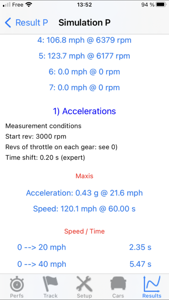 The simulator achieves a maximum acceleration lasting 60 seconds performed by a PERFECT driver, capable of making a perfect start while remaining at the grip limit on starting in clutch control at 3000 rpm (and also after the start if the car is violent!), to push all its gears to the ideal max revs, and to change them in just 0.20 s, which is ultra fast with a manual gearbox. On the other hand, the grip coefficients used are those of old tires (90s), and they will be reviewed in a future update. But all in all, the best times you will do in your acceleration measurements should be very close to those calculated by the simulator, which represent, to summarize, optimal reference times but achieved with non-optimal tires and with a standard starting strategy not necessarily optimal for all cars!