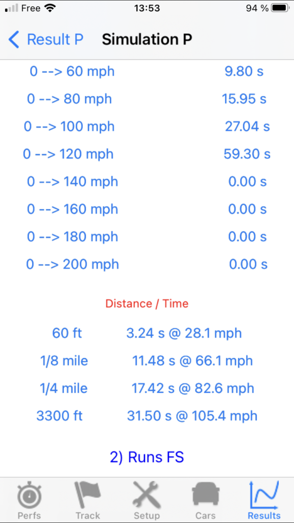 The simulator carries out a run flying start from a speed x to a speed y starting on a gear z, with x, y, and z mentioned in the Setup. Of course, if the speed y is unreachable, it will tell you!