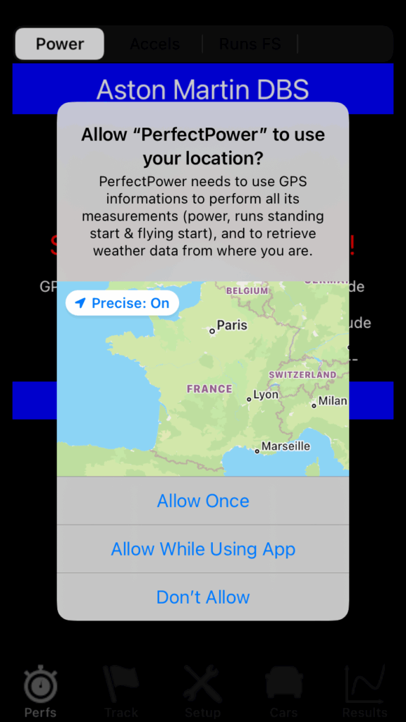 When you first open the app, you’ll be asked whether you want to allow PerfectPower to access the “Precise” (GPS) device’s location, as well as how often you want to access it (3 choices: “Allow Once”, “Allow While Using App”, or “Don’t Allow”). Although this is obvious, thank you for selecting the following two choices:
