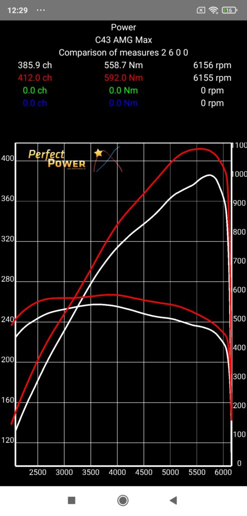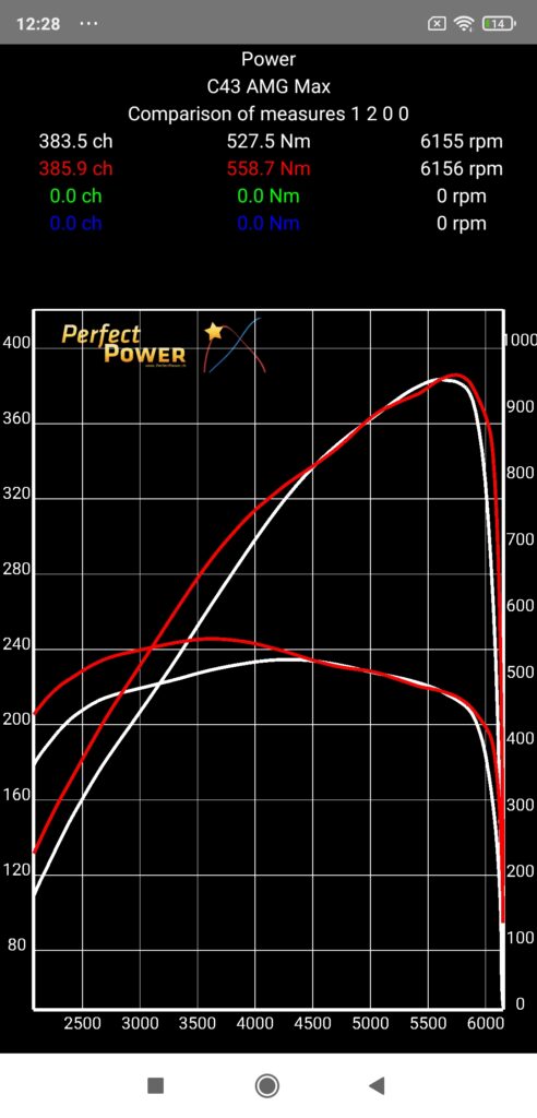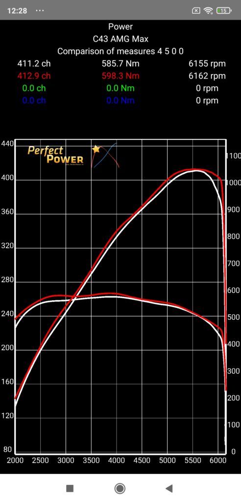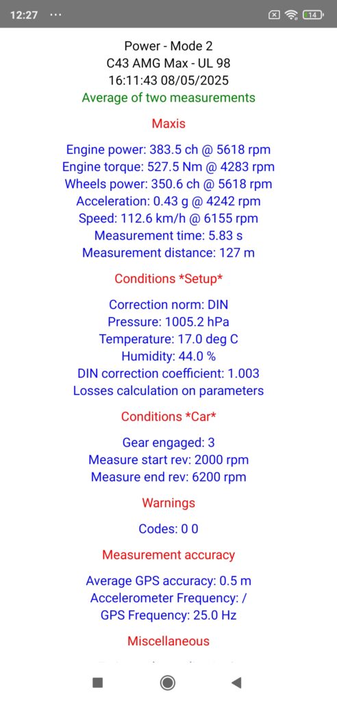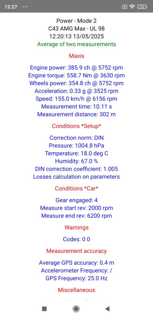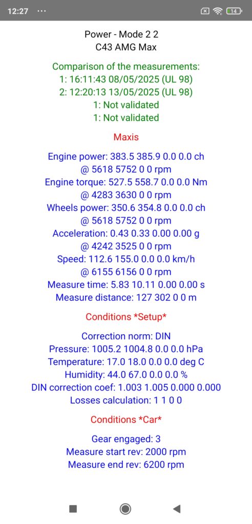 But in this case, the difference is such that we have an overboost effect in 4th gear that we do not have in 3rd gear, limited however to 4500 rpm, and as the engine results (measured in stabilized rev, but NEVER in dynamic!) are always homologated without overboost, this is why the results obtained on the road in 3rd gear are ultimately the most “realistic” if we want to compare them to the manufacturer data, BUT all this is only a question of reference since on the contrary, if you want to be able to compare them to those obtained on a braked dyno where the acceleration rates are always moderate (minimum 10 s measurement time) and where we generally measure at least on the 4th gear, then on the contrary you will have to carry out your measurements on the road in 4th gear! All this with this C43 AMG of course!