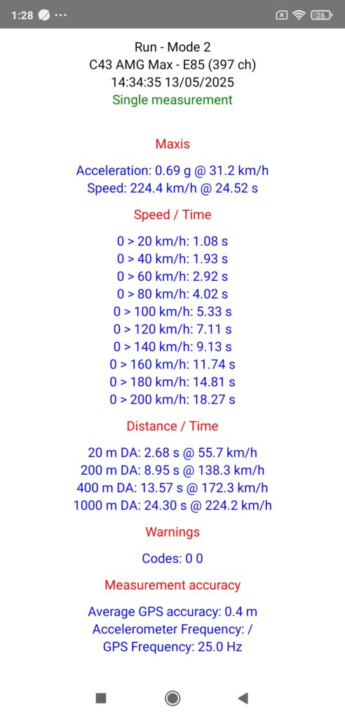 Note 2: We just have a doubt about the start because we didn’t feel a strong push right away but only about a second later, which is completely confirmed by our measurement with a bad 0 to 20 km/h time for such a car, especially in four-wheel drive (1.08 s)… Cedric, who was driving, confirmed to me that he pressed fully the accelerator from the start… but normally, we should have been instantly glued to the seat from the start (which this E55 AMG does perfectly!), so we can only assume that it’s due to an extremely soft start management by the gearbox ECU in the selected mode… however, if the opportunity arises one day, we will measure the accelerations of this C43 AMG again to be sure!