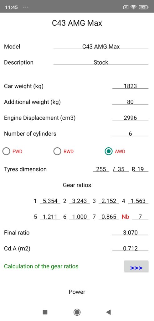 Note 1: The car weight is given with a full tank (PerfectPower and manufacturer standard) and the additional weight with a 80 kg (176 lb) person on board (arbitrary standard), but these two fields must of course be systematically adapted to the real measurement conditions during each session!