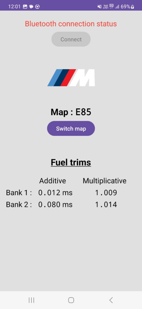 It will soon be possible, thanks to a small Bluetooth box (2×2×4cm) connected to the OBD port and a smartphone application (Android for the moment), to drive several engine maps and view certain important information coming from the engine ECU. Here is an example for a dual map UL/E85. This will initially be available for the M3 E36 3.2L, Z3M and M3 E46.